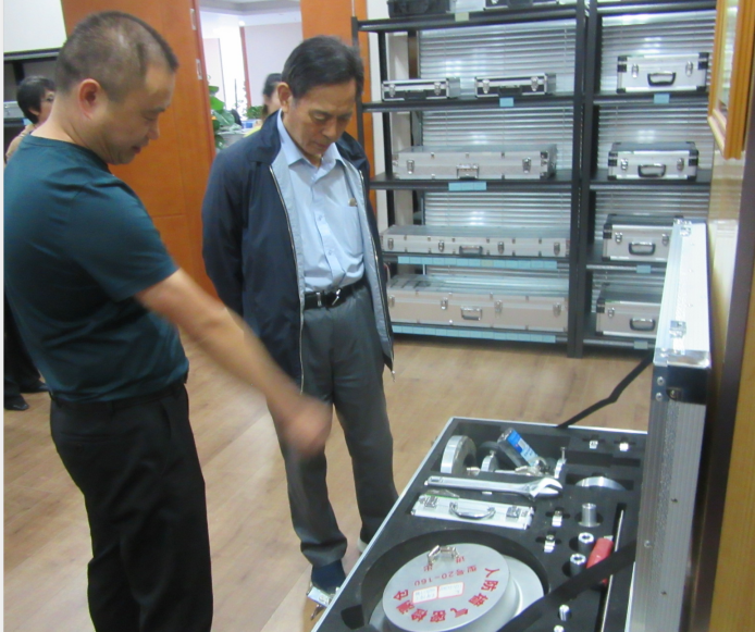 在鼎立九州綜合辦公區,牛銀漢秘書長參觀了“專利區”,我司人員親自演示獲得國家專利檢測設備的使用,并進行講解。在多媒體中心觀看了鼎立九州十周年歷程影片,并聽取了我司在業務拓展、文化建設、技術研發等方面的匯報。